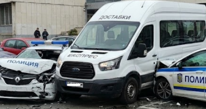 Бус помете няколко патрулки пред Районното управление