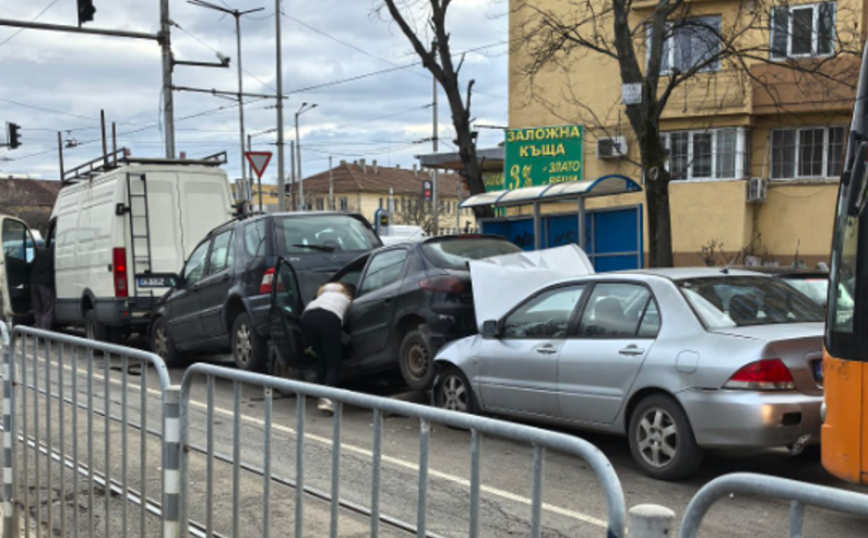 Верижна катастрофа с много коли и автобус в София