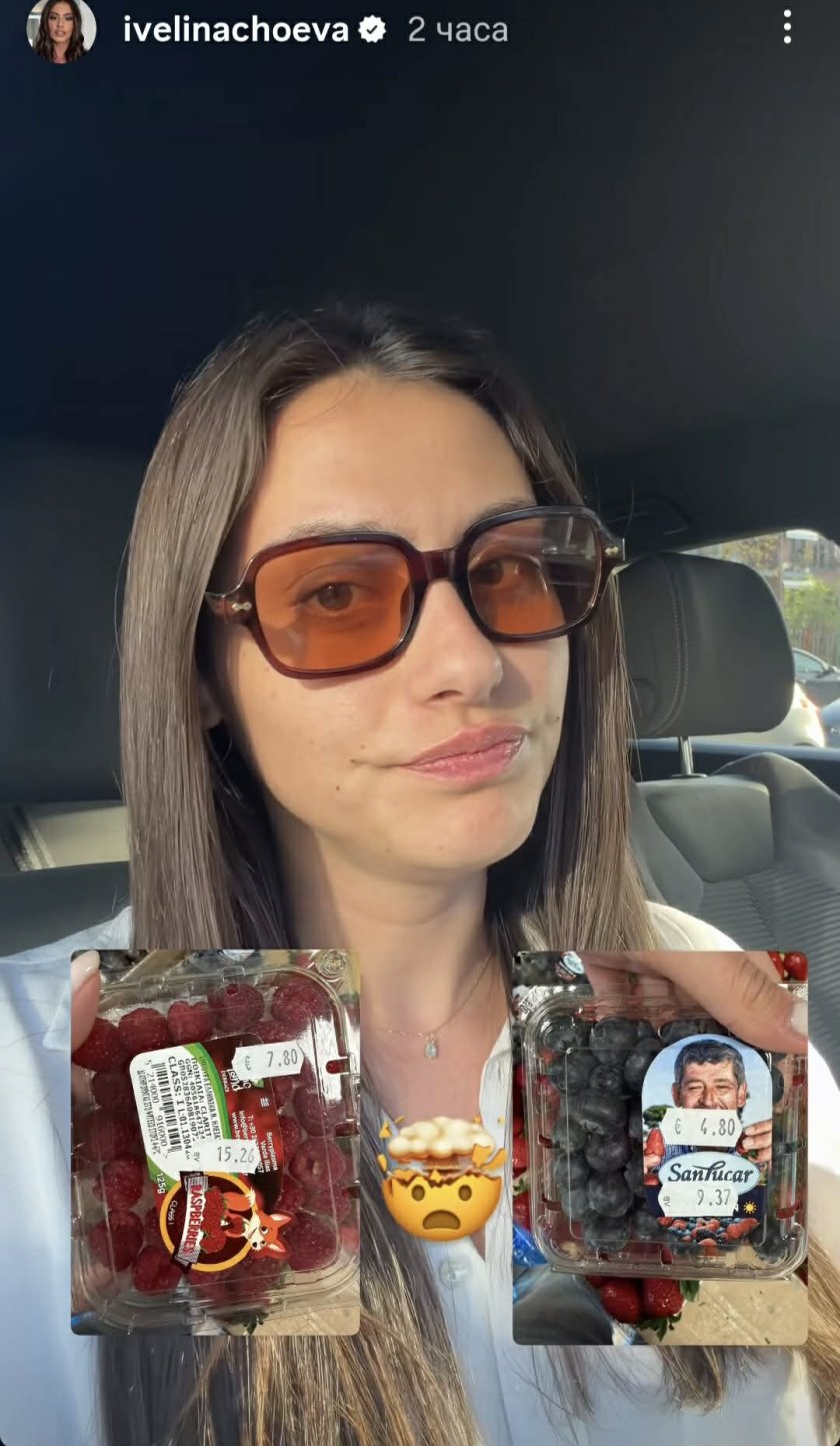 Ивелина Чоева се възмути от високите цени на плодовете. Моделката публикува кратко видео, в което показва малини и боровинки, продавани в малки кутийки от по 125 грама на цени между 7 и 8 евро. Видимо изненадана, тя не скри реакцията си и дори се пошегува, че човек трябва сериозно да се замисли дали изобщо да си позволи подобен „лукс“.