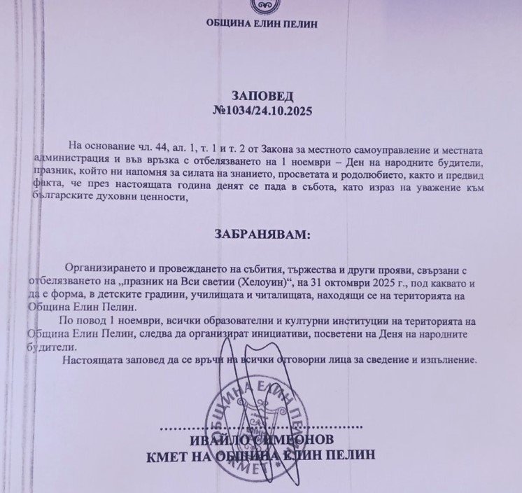 Празнуването на Деня на народните будители в Елин Пелин всяка година е традиция, на която кметът Ивайло Симеонов много държи. За сметка на това той за пореден път забрани празнуването на Хелоуин с официална заповед седмица по-рано.