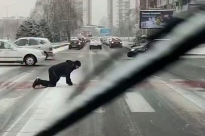 Поледица в Скопие: Мъж лази по пешеходна пътека в града (ВИДЕО)